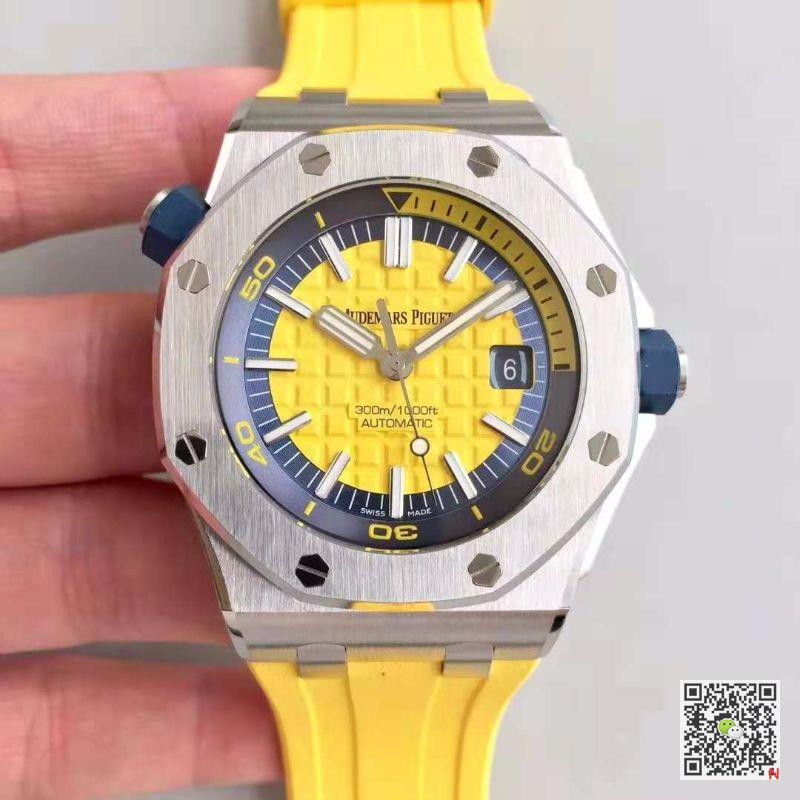 The Replica Audemars Piguet Royal Oak Offshore Diver 15710ST.OO.A051CA.01 JF Factory V3 Yellow Dial watch is a 1:1 replica of the JF Factory using top materials comparable to the original. If you are not a professional watchmaker, it is difficult to distinguish the true from the false. If you like this high-quality Replica Audemars Piguet watches, now you can buy a luxury watch with very little money, and we support global delivery.