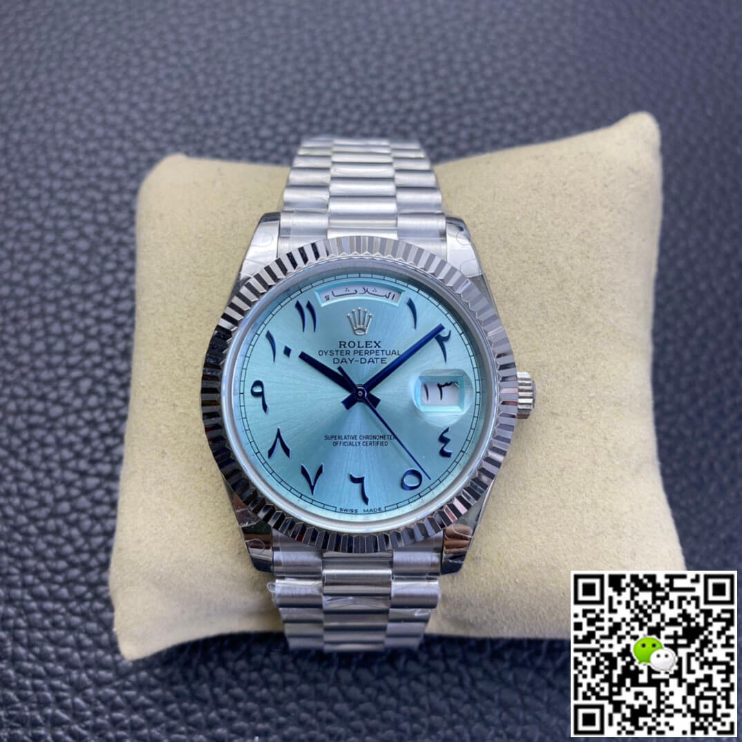 The Replica Rolex Day Date EW Factory Middle East Custom Ice Blue Dial watch is a high-quality luxury fake watch made by EW Factory using the same top materials as the original. Its appearance and function are very close to the original Rolex watch.