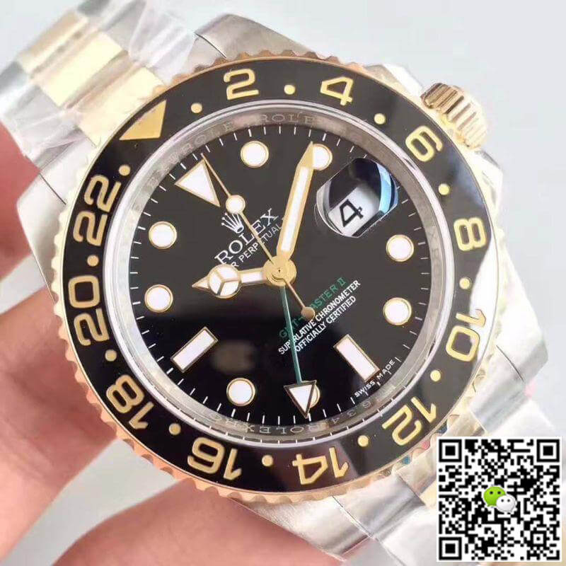 The Replica Rolex GMT-Master II 116713LN Noob Factory V9 Rose Gold Bezel watch uses top-quality materials comparable to the original. The watch cover is the same original high-transparency sapphire crystal glass, and some styles of blue-coated sapphire are all blue-coated, so it is difficult to distinguish the true from the false. The stainless steel case and strap are made of the same original 904L and 316L, E.g Noob Rolex V10. The carbon fiber case is also comparable to the original high-hardness carbon fiber material. The ceramic bezel material and surface color fonts are the same. The factory uses high-quality materials, and this Replica Rolex GMT-Master II 116713LN Noob Factory V9 Rose Gold Bezel watch can hardly be distinguished from the real from the appearance.